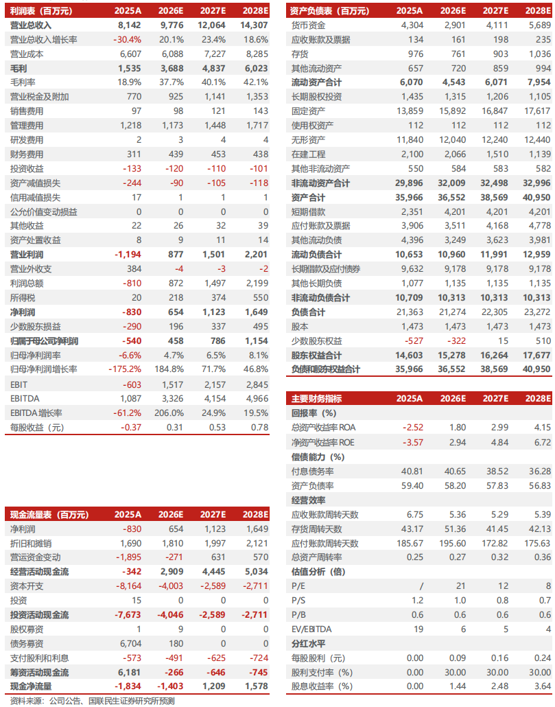 1)2025年:公司实现煤炭产销量1444.2/1257.7万吨,同比+4.2%/+0.1%;吨煤售价493.4元/吨,同比-21.8%;吨煤销售成本359.6元/吨,同比-5.9%,单位生产成本306.1元/吨,同比-6.1%;吨煤毛利133.9元/吨,同比-46.2%;煤炭业务毛利率27.1%,同比-12.3pct。2)26Q1:公司实现煤炭产销量355.9/349.7万吨,同比-3.4%/+21.1%;吨煤售价535.9元/吨,同比-0.5%;吨煤销售成本374.9元/吨,同比+13.3%;吨煤毛利161.0元/吨,同比-22.4%;煤炭业务毛利率30.0%,同比-8.5pct。2026年,公司计划实现煤炭产量1450万吨,90万吨/年芦河煤矿预计于2027年3月联合试运转。