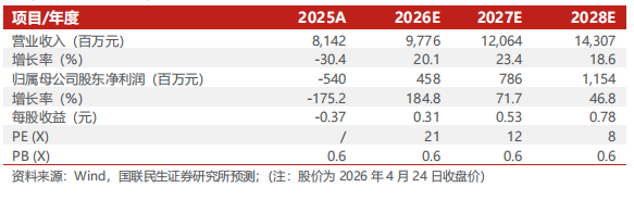 2026年4月23日,公司发布2025年年报和2026年一季报。2025年,公司实现营业收入81.42亿元,同比下降30.4%;归母净利润-5.40亿元,同比盈转亏。2026年一季度,公司实现营业收入24.10亿元,同比增长9.9%;归母净利润-0.27亿元,同比盈转亏。